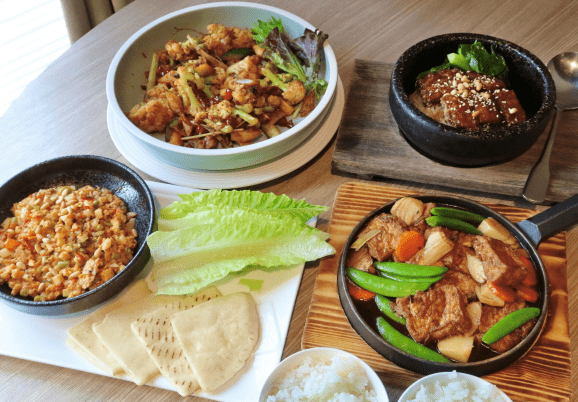「漢來蔬食」巨蛋店設有獨立包廂,專業侍酒師能搭配有機葡萄酒,推薦點選其招牌的松露百菇鍋與港式點心拼盤。「蓮香齋」宴會廳可容納30桌,提供客製化桌菜服務,其素佛跳牆與富貴雙方是婚宴熱門菜色。